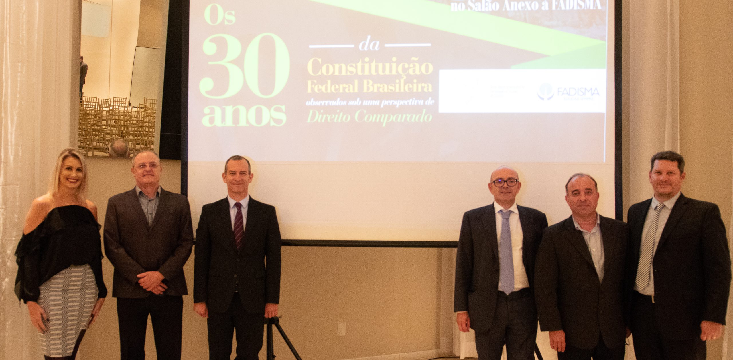 Na última terça-feira (25), a FADISMA, através do Núcleo de Estudos de Direito Internacional, promoveu uma palestra sobre o trigésimo aniversário da Constituição Federal de 1988. O evento contou com três palestrantes internacionais, professores Martin Julian Acevedo Miño e Rodrigo Devinar, da Facultad Teresa de Ávila, da Pontificia Universidad Católica Argentina (UCA); Angel Pelayo Gonzales Torre, da Universidad de Cantábria; e o pesquisador do Instituto de Pesquisa Econômica Aplicada, Daniel Cerqueira.