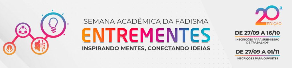 Estão abertas as inscrições para a 20ª Semana Acadêmica EntreMentes da FADISMA. Neste ano, o evento será realizado nos dias 7 e 8 de novembro na modalidade híbrida e terá como slogan “Inspirando Mentes, Conectando Ideias – Especial 20 anos”.