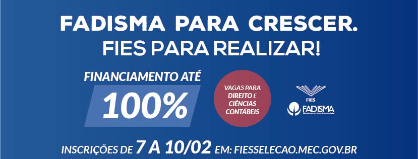 O Ministério da Educação abriu as inscrições para o Fundo de Financiamento Estudantil (Fies). Estudantes que queiram pleitear financiamento em Direito ou Ciências Contábeis na FADISMA têm até sexta-feira (10) para acessar o site do programa e concorrer a uma das 59 vagas ofertadas nesta edição do programa para a IES. São 26 delas no Direito Diurno; 26 no Direito Noturno e; 7 em Ciências Contábeis (noturno).