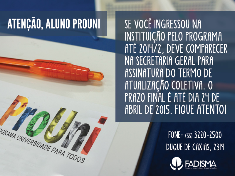 Você que ingressou no programa até 2014/2 (Direito e Contábeis) tem um compromisso – deve comparecer à Secretaria para assinar o Termo de Atualização Coletiva do Prouni.