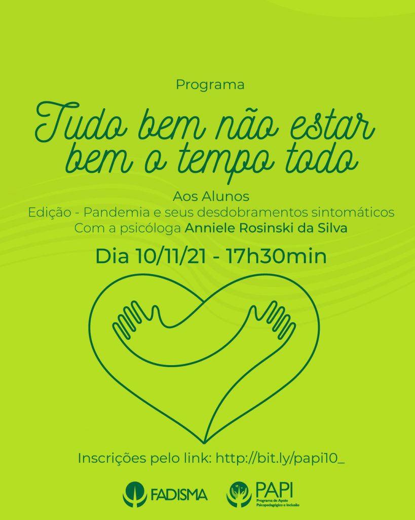 A Coordenação de Ingresso e Permanência – CINPER e o Programa de Apoio Psicopedagógico e Inclusão – PAPI da FADISMA promovem um espaço para abordar desdobramentos relacionados à fadiga pandêmica, ansiedade e depressão, de forma mais focal, e contribuir para conscientização, orientação e partilha junto a todos que fazem parte da Instituição.