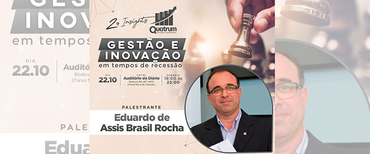 No próximo dia 22, o Diretor Geral da FADISMA, professor Eduardo de Assis Brasil Rocha, irá palestrar no Insights Quatrum – evento realizado pela Quatrum Soluções Empresariais, que tem por objetivo discutir ações inovadoras para que empresas e organizações possam permanecer competitivas no mercado. O evento acontecerá no auditório do Diário de Santa Maria, das 18 às 22h.