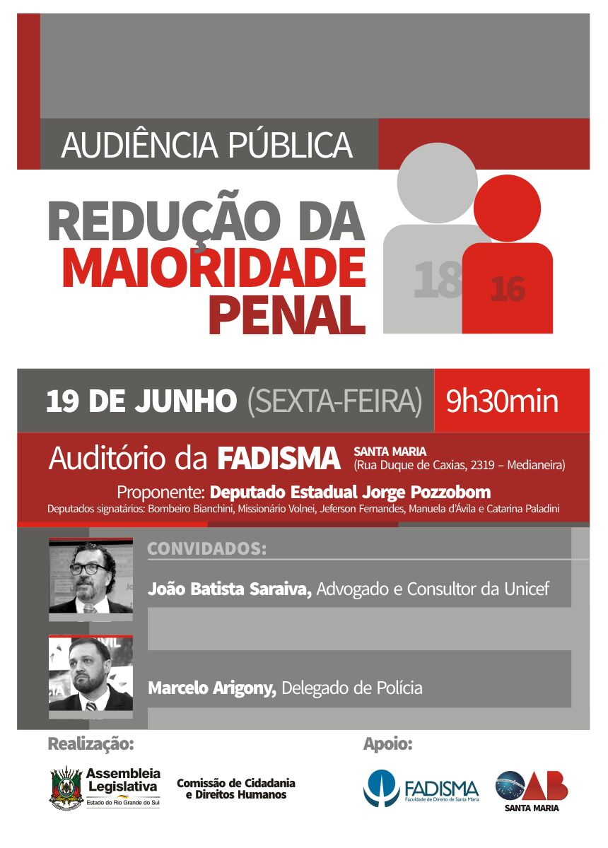 Por intermédio do Professor Giovani Bortolini, vice-diretor Geral, junto ao Palácio Farroupilha e a Comissão de Cidadania e Direitos Humanos da casa, a FADISMA realiza, no salão anexo à IEs, uma importante audiência pública sob a temática Redução da Maioridade Penal. Isso, dada a PEC nº 171, que altera a redução do artigo 228 da Constituição Federal (imputabilidade penal do maior de dezesseis [16] anos), em tramitação no Congresso Nacional.