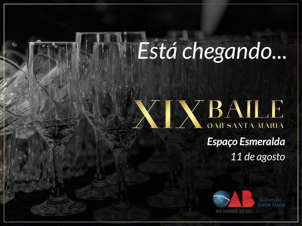 O tradicional jantar baile, promovido pela OAB Subseção de Santa Maria, ocorre no dia 11 de agosto em comemoração ao dia do advogado, no Espaço Esmeralda, a partir das 21h30min.
