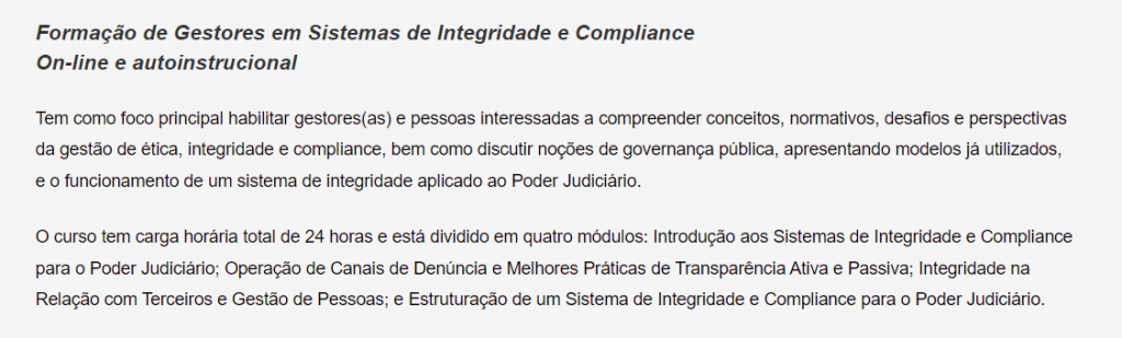 São duas as capacitações elaboradas, realizadas e acompanhadas pela FADISMA, que possui ampla expertise no design instrucional e, por conseguinte, educação a distância: Princípios Básicos em Integridade e Compliance e Formação de Gestores do Poder Judiciário em Integridade e Compliance.