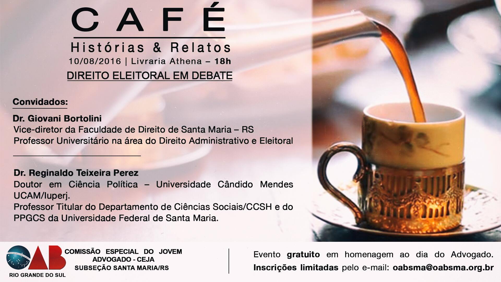 Em homenagem ao dia do advogado, a Comissão Especial do Jovem Advogado (CEJA/SM) conta com a comunidade acadêmica, em especial formandos e egressos para um evento diferenciado, o Café, Histórias e Relatos.  A atividade acontecerá no dia 10 de agosto de 2016. O nosso vice-diretor geral, professor Giovani Bortolini, é um dos protagonistas.
