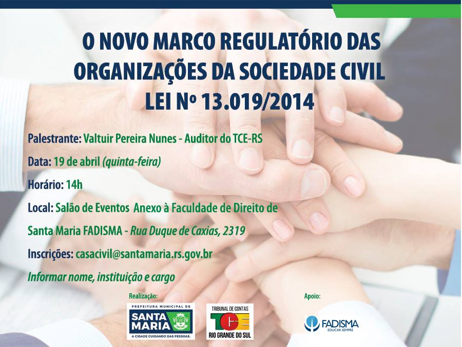 Em parceria com a Prefeitura Municipal de Santa Maria e com o Tribunal de Contas do Estado do Rio Grande do Sul, a FADISMA recebe hoje à tarde uma palestra sobre a Lei Nº 13.019/2014, que dispõe sobre o Novo Regime Jurídico das Parceiras Voluntárias na Administração Pública.