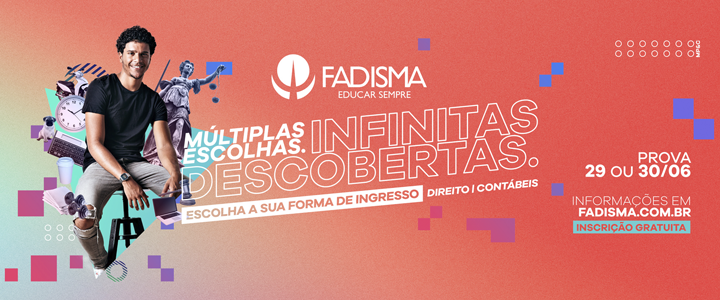 Chegou a época de contarmos com novas histórias no ensino superior. O Ingresso FADISMA está com inscrições abertas! São múltiplas escolhas para você ser um estudante de Direito ou Ciências Contábeis e adentrar em um mundo de infinitas descobertas. Você escolhe a sua forma de ingresso. Confira as categorias: