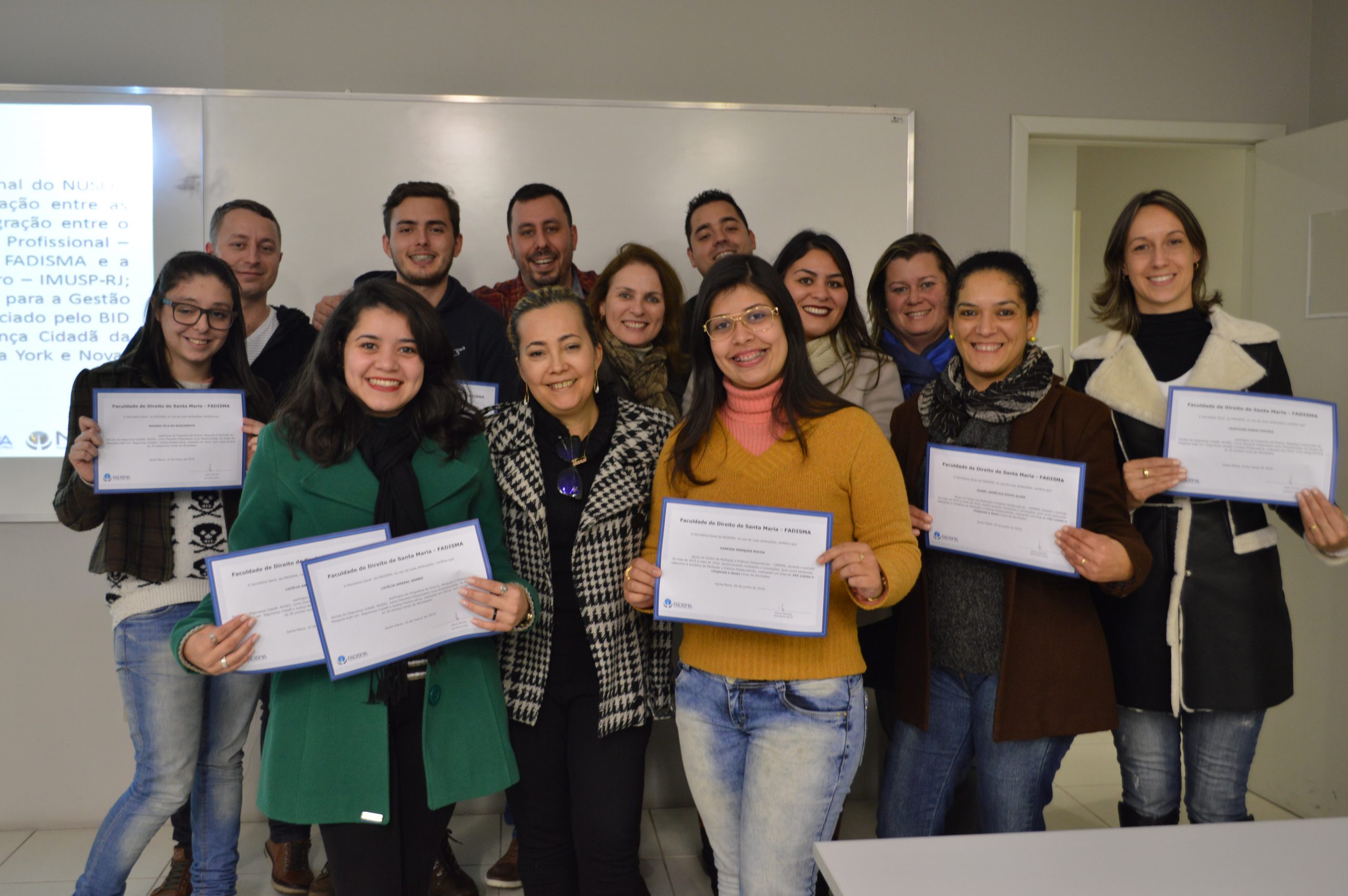 O Workshop Aberto com a temática “Inovações no Campo da Pesquisa Empírica em Segurança e Justiça, promovido pelo Núcleo de Segurança Cidadã, rendeu orgulho e sensação de dever cumprido. Além, é claro, de muitas expectativas. A atividade ocorreu, há pouco, na sala 309. A oportunidade trouxe esclarecimentos acerca da dinâmica dos Grupos de Estudo e outros aspectos do edital em vigor (ver o número 25, em www.fadisma.com.br/editais). O momento mais marcante ficou por conta da informal cerimônia de certificação dos docentes e discentes da 1ª e 2ª turma do NUSEC e, do Centro de Mediação e Práticas Restaurativas , projeto encabeçado pelo NUSEC e pelo Núcleo de Prática Profissional e Empreendedorismo.