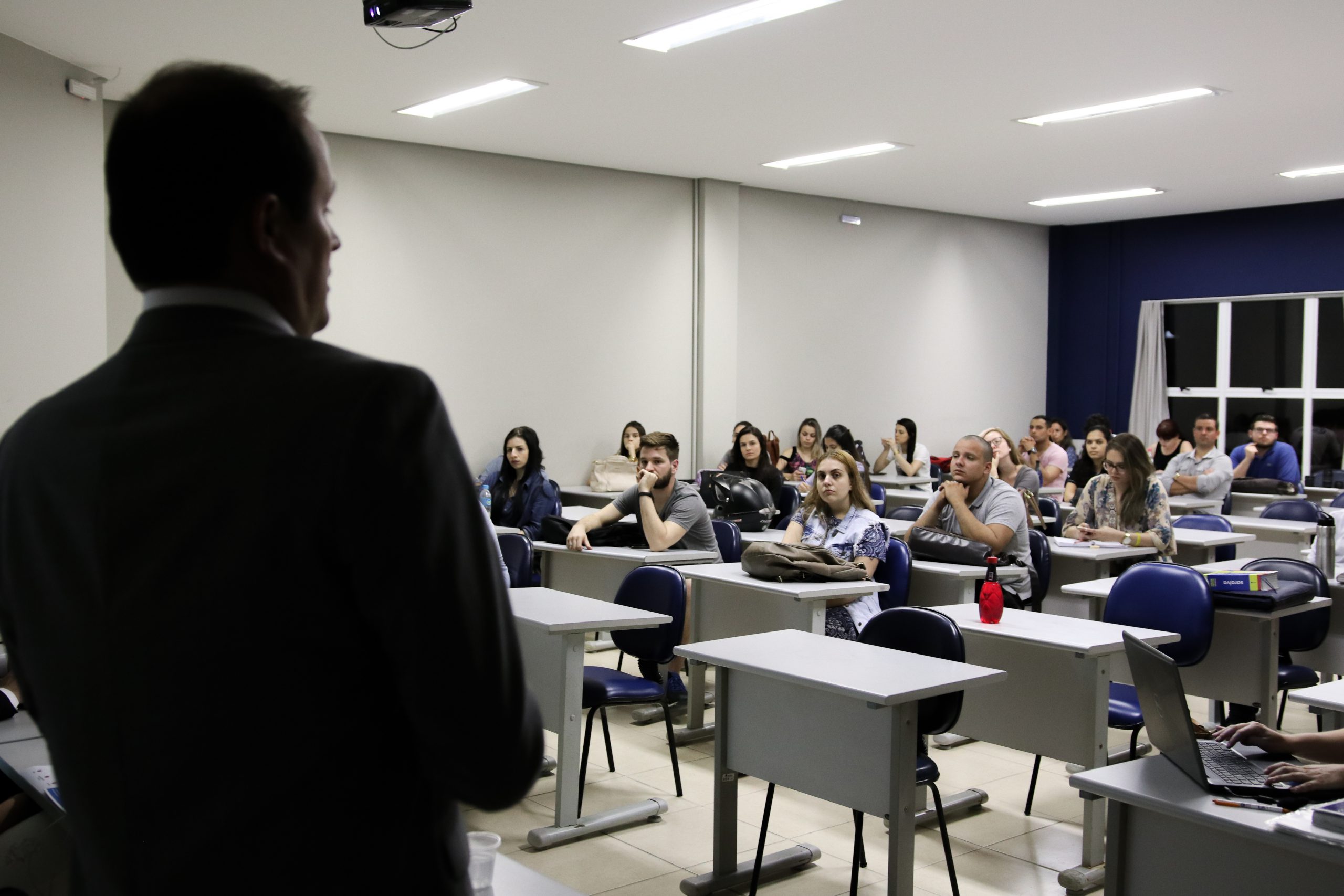 Pela amplitude do tema, pauta jurídica que se estende também à Administração e às Ciências Contábeis, as turmas de Direito Constitucional II, do curso de Direito, e Direito Empresarial, do curso de Ciências Contábeis, se fundiram na sala 302 para participar da atividade.
