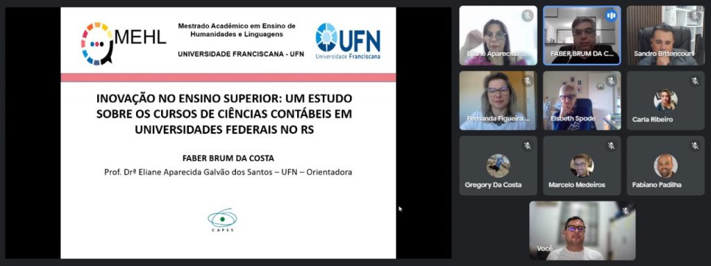 Por último, também em agosto, o professor Faber Brum da Costa defendeu sua dissertação, que leva o título “Inovação no Ensino Superior: um estudo sobre os cursos de Ciências Contábeis em universidades federais no RS” pelo Mestrado Acadêmico em Ensino de Linguagens e Humanidades da UFN.
