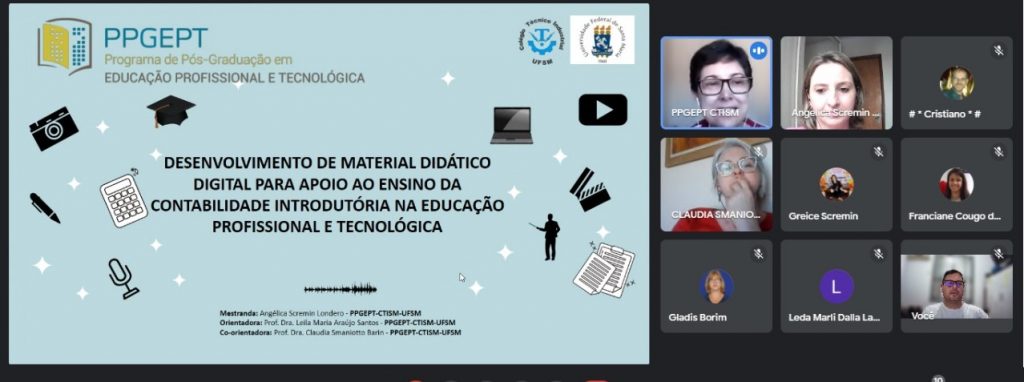 Já no final de agosto, a professora Angélica Scremin defendeu a sua dissertação de mestrado intitulada “Desenvolvimento de material didático digital para apoio ao ensino da contabilidade introdutória na educação profissional e tecnológica”, pelo Programa de Pós-Graduação em Educação Profissional e Tecnológica da UFSM.