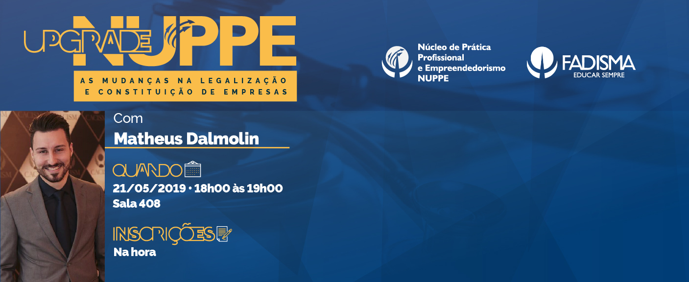 O Núcleo de Prática Profissional e Empreendedorismo promove nesta terça-feira mais uma edição do Upgrade NUPPE. A palestra intitulada “As mudanças na Legalização e Constituição de Empresas” será ministrada pelo contador Matheus Dalmolin.
